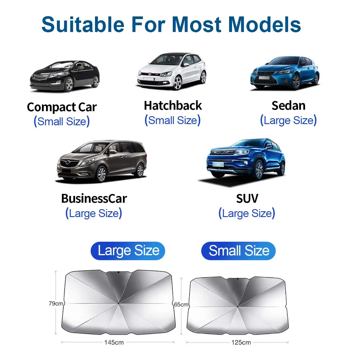 カーサンシェードアンブレラの取り付けは簡単で、セットアップに工具は必要ありません。柔軟なデザインにより、セダンから SUV、ハッチバックまで幅広い車種に適合し、ほとんどの車両にぴったりとフィットします。中型サイズ (65X120cm) は小型車に最適で、大型サイズ (78X140cm) は大型車に最適で、フロントガラスを十分にカバーします。サンシェードの使いやすいメカニズムにより、毎日の使用に手間のかからないソリューションとなり、有害な太陽光線から車内を保護します。